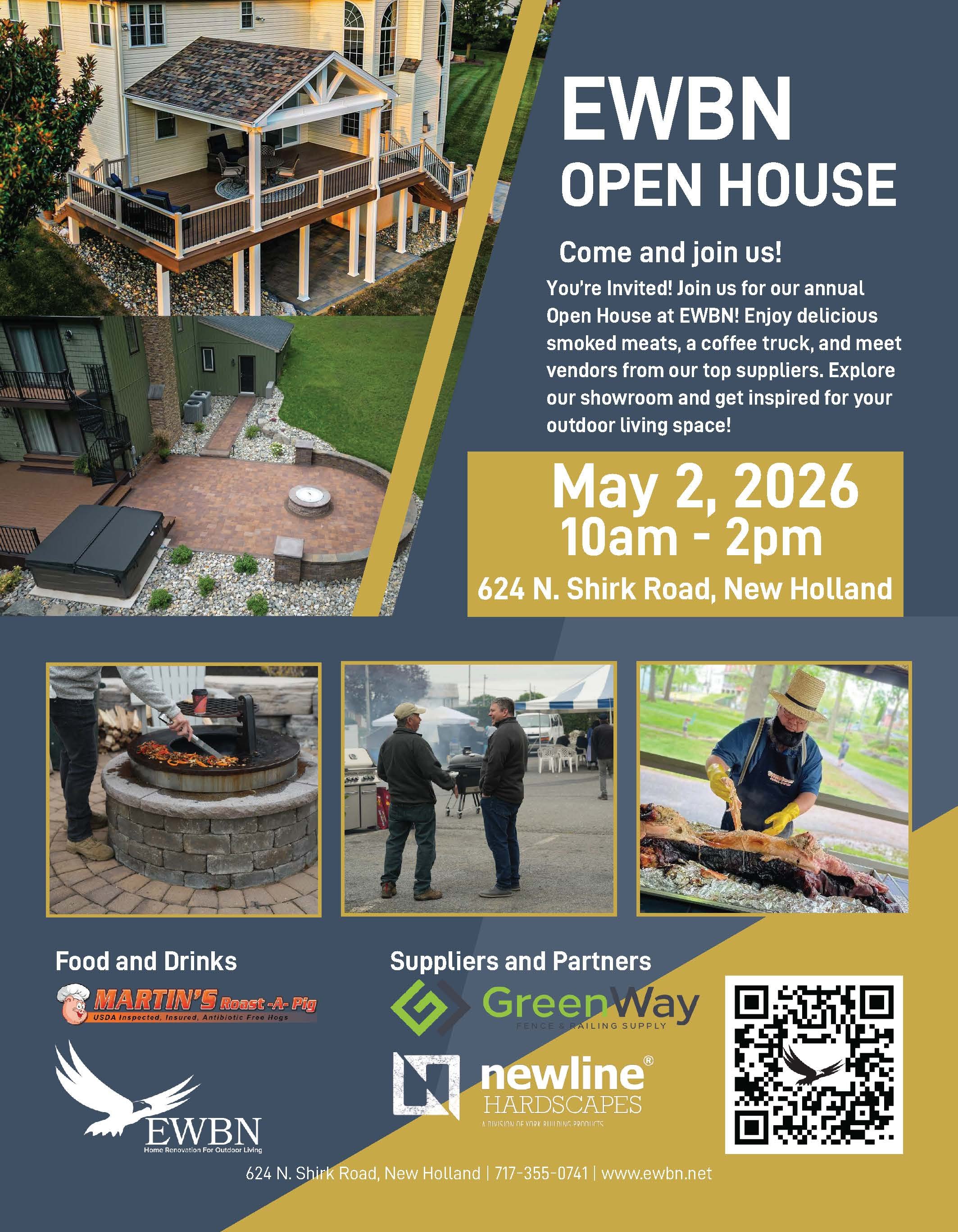 You’re Invited! Join us for our annual Open House at EWBN! Enjoy delicious smoked meats, a coffee truck, and meet vendors from our top suppliers. Explore our showroom and get inspired for your outdoor living space!.